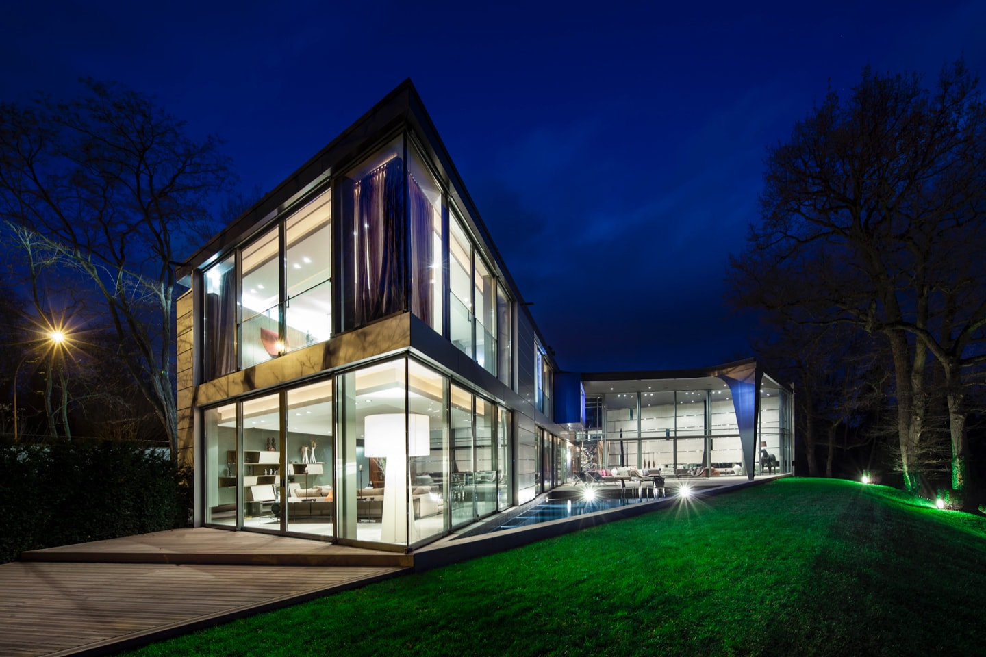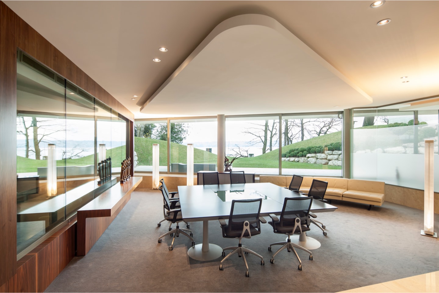 Featuring a swimming pool with spa, a living room overlooking the lower terrace and gardens, a conference room that can also be used as a movie theatre, service rooms, an en suite bedroom and a large garage, the lower floor forms an almost invisible link between the main house and the annex.