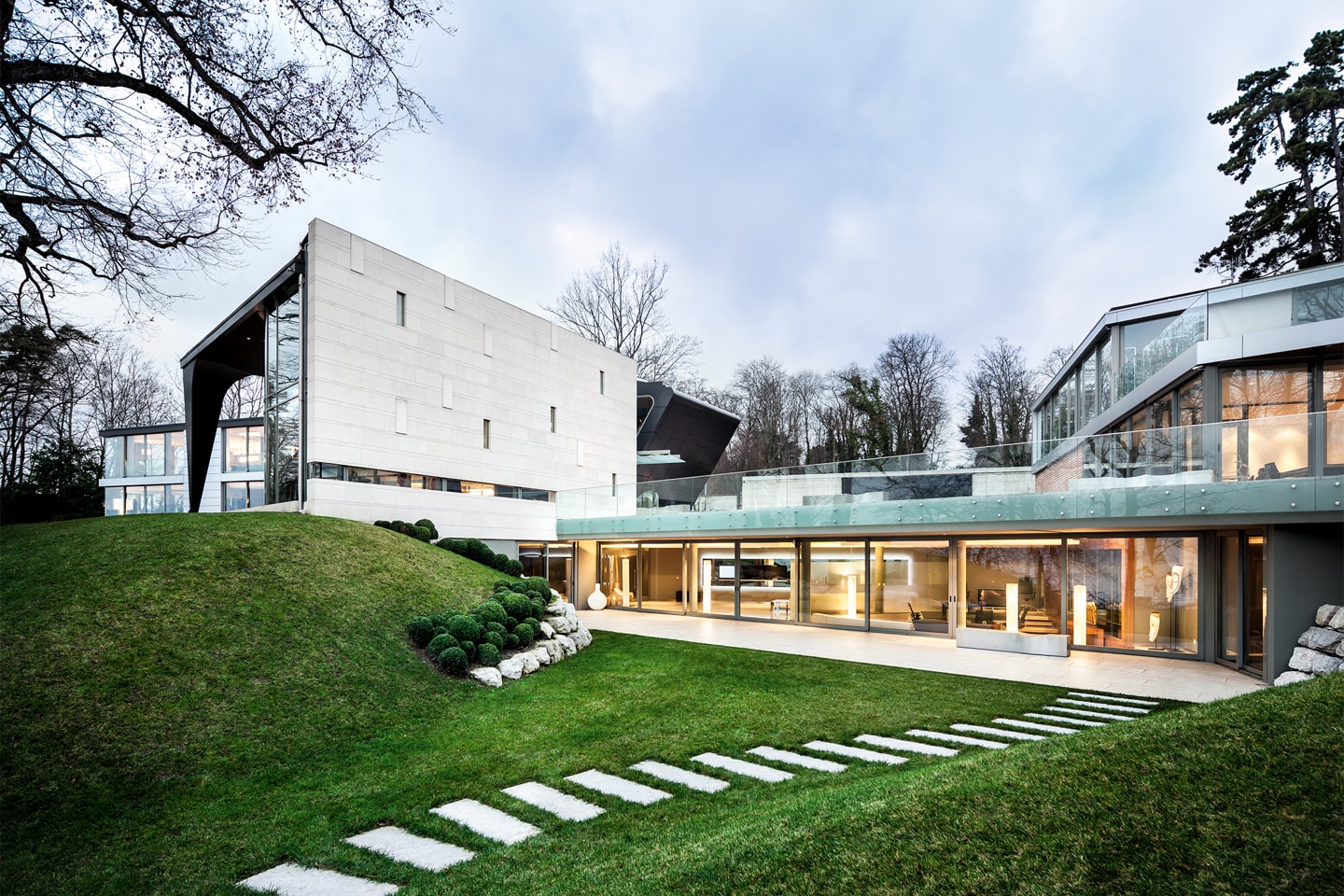 Construite en 2010, surplombant une eau bleue scintillante et des étendues de pelouses vertes bien entretenues, cette propriété très spéciale avec une forme triangulaire s’étend jusqu’au bord de l’eau avec une vue en tribune sur la chaîne de montagnes scintillantes du sommet du Mont-Blanc.