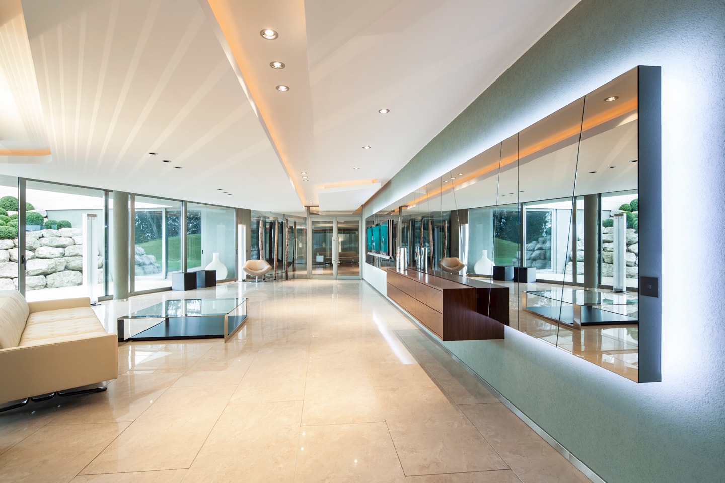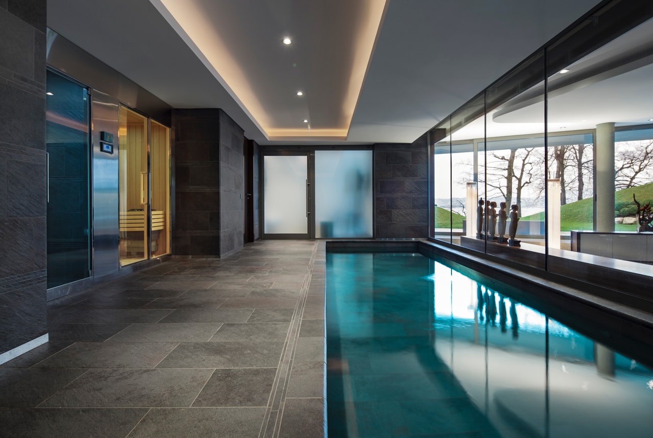 Doté d’une piscine avec spa, d’un salon donnant sur la terrasse inférieure et les jardins, d’une salle de conférence pouvant également servir de cinéma, de salles de service, d’une chambre en suite et d’un grand garage, l’étage inférieur forme un lien presque invisible entre la maison principale et l’annexe.